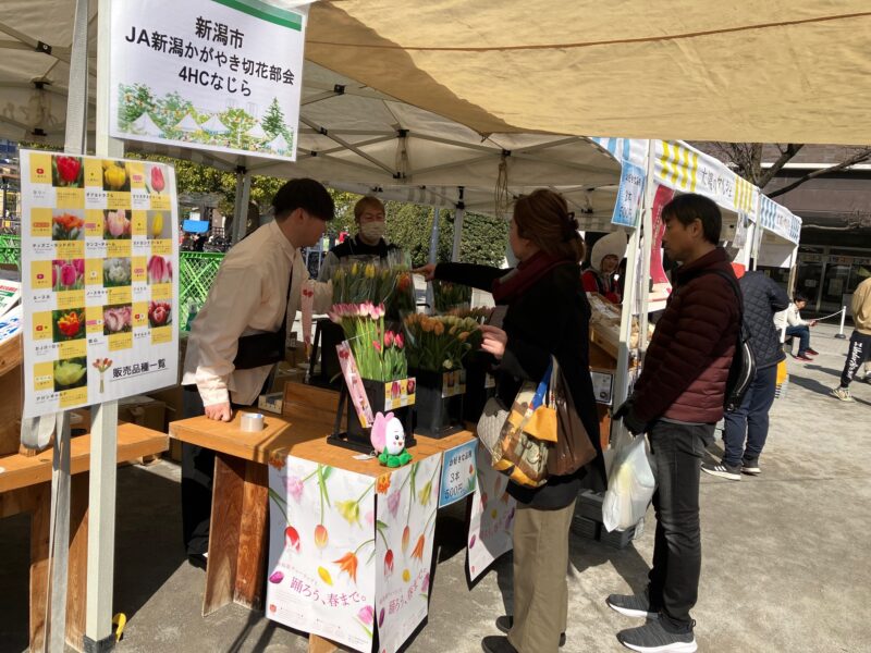 南区の生産者やJA担当者とともに出店し、13品種の色とりどりのチューリップを販売。また、西区・西蒲区の生産者グループも併せて出店し、新潟市産米や野菜などを販売しました。