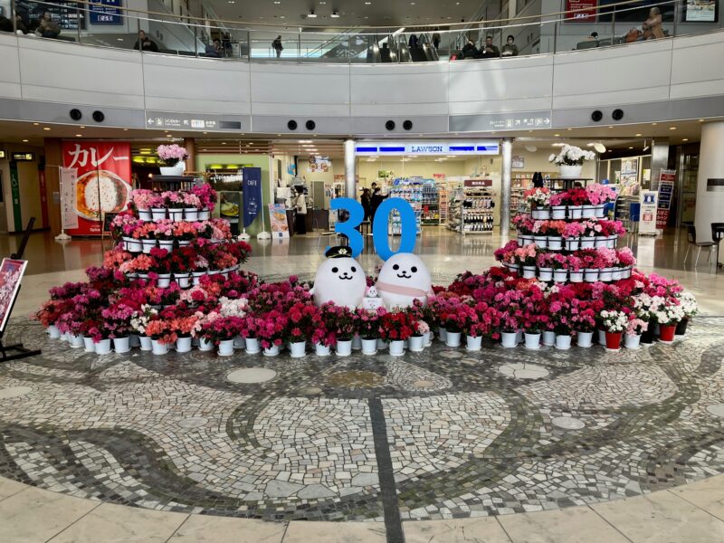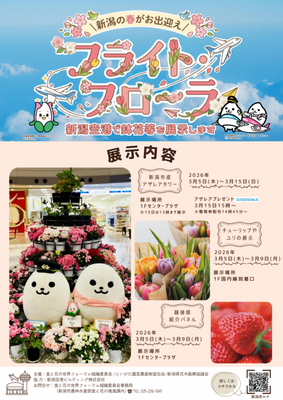 新潟空港を会場として、令和8年3月5日(木)から15日(日)まで、新潟市産アザレアタワーやチューリップとユリ切り花の展示、越後姫紹介パネルの展示を実施。会場を花々で彩り、訪れた人々をお出迎えしました。